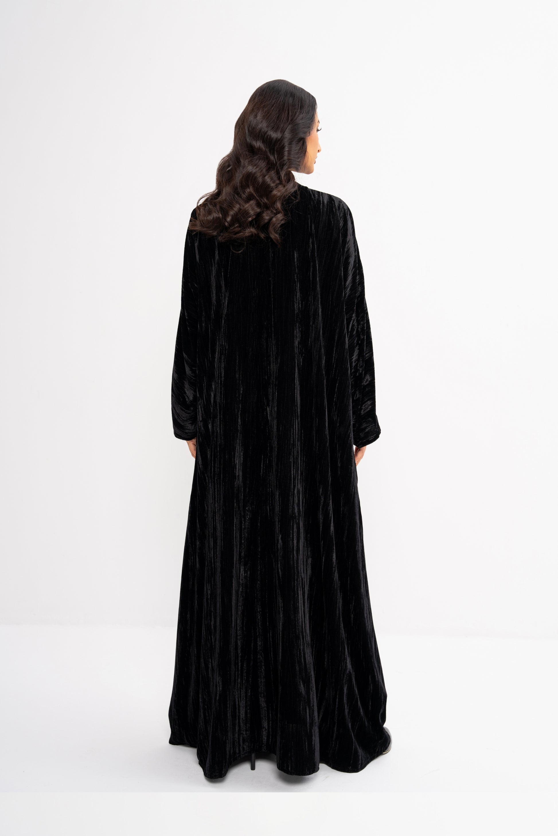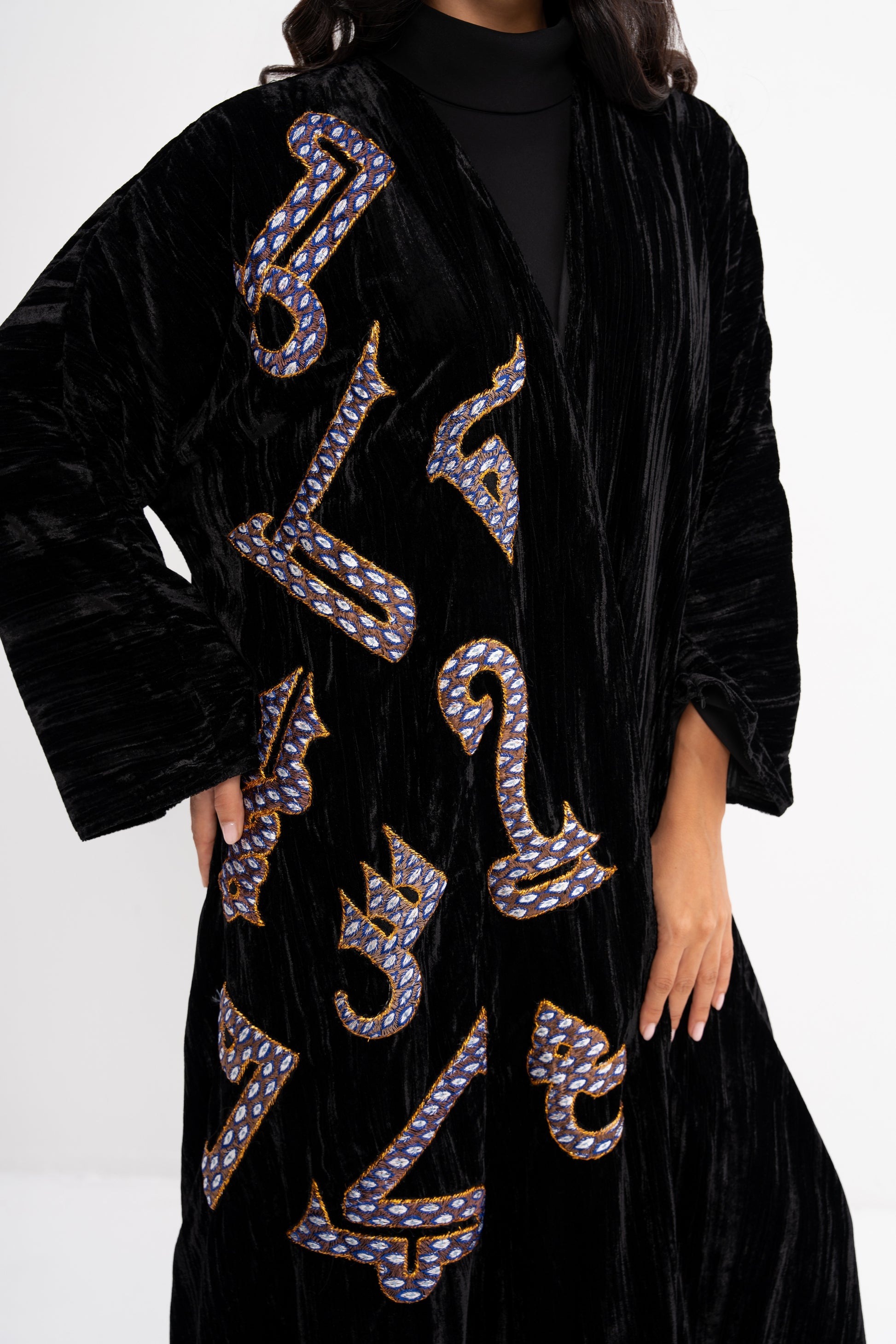 عباءة مخملية مزينة بتطريز رائع للأحرف العربية. تجمع بين الملمس الفاخر والأناقة الثقافية، مثالية للمناسبات الخاصة والاحتفالات.