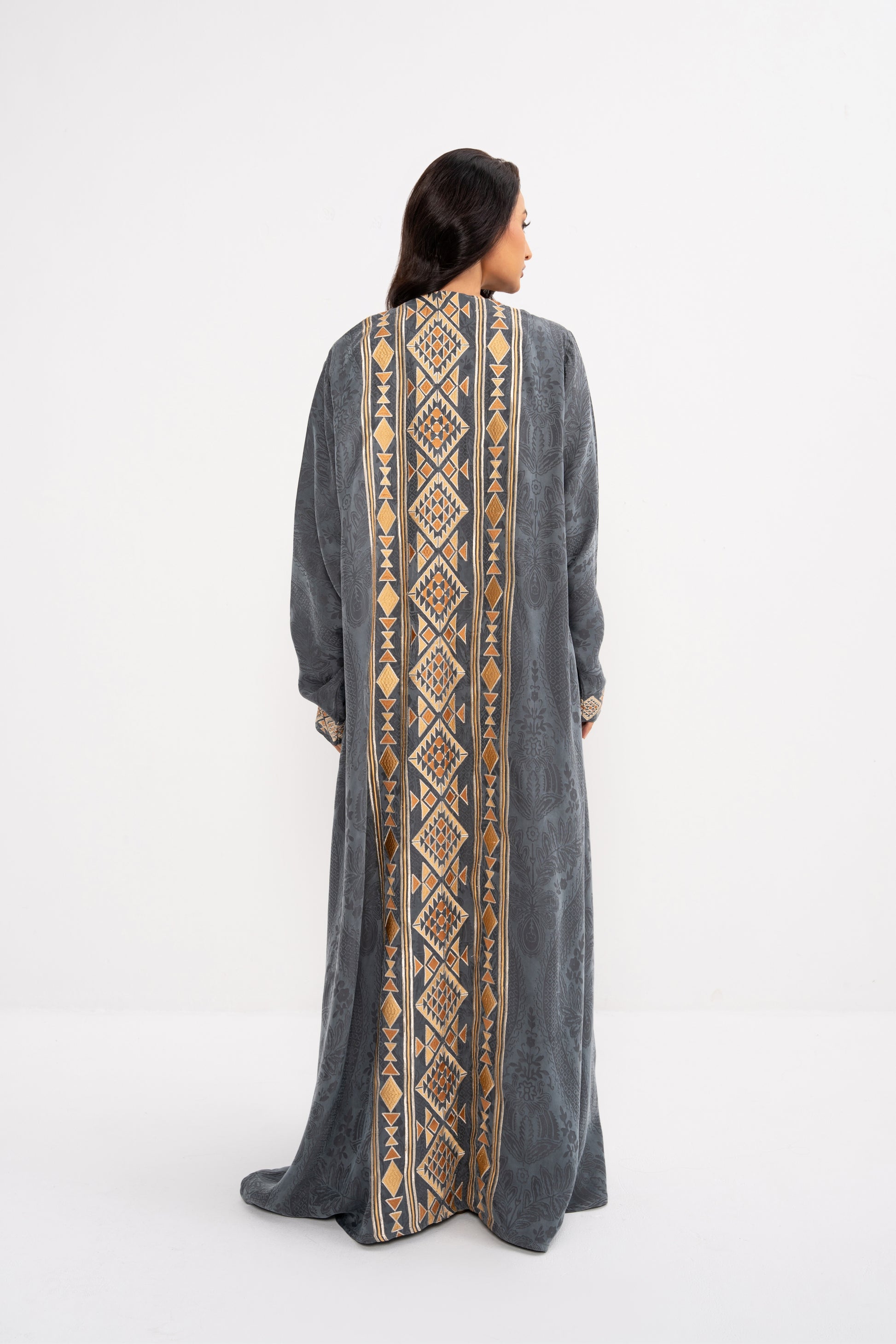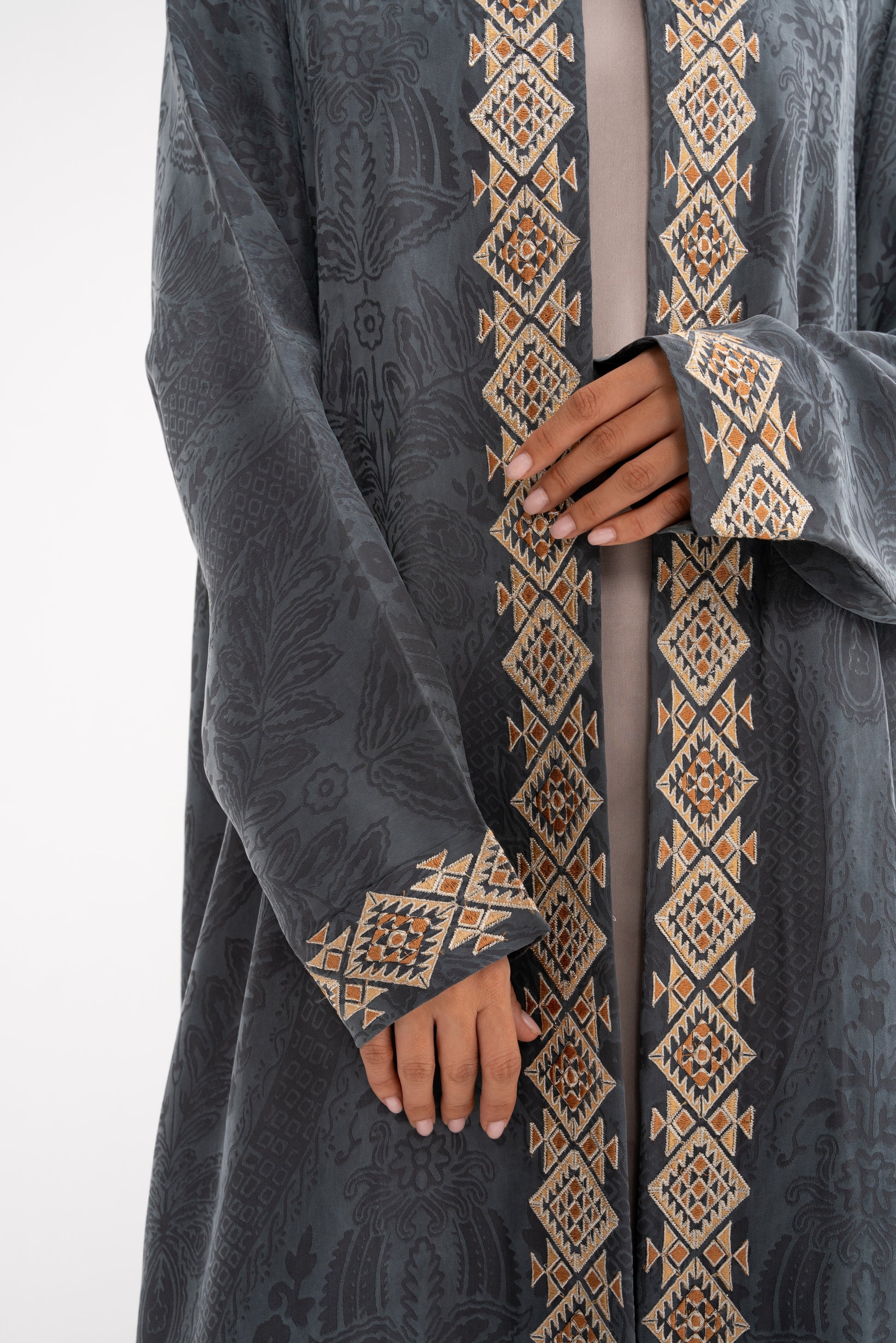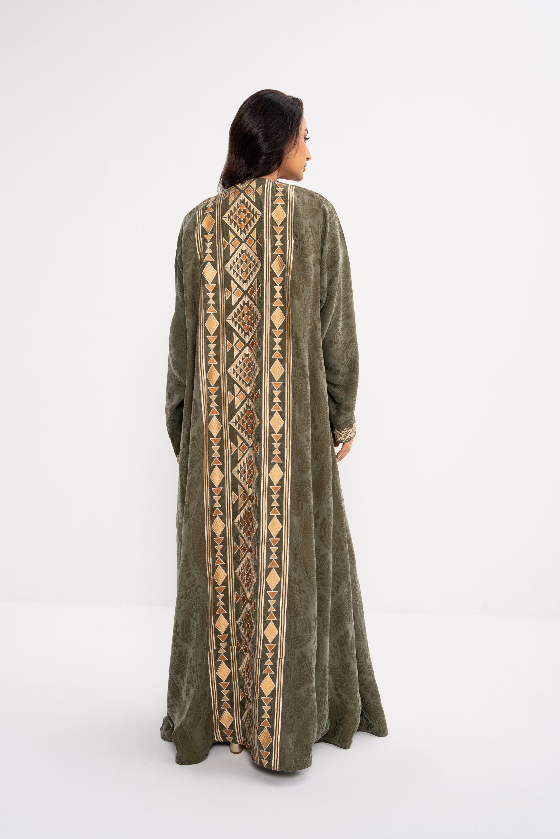 عباءة مع طرحة متناسقة مصنوعة من قماش الجاكار المخملي الخفيف، ومطرزة بتفاصيل هندسية تراثية على طول الجزء الأمامي والخلفي من العباءة.