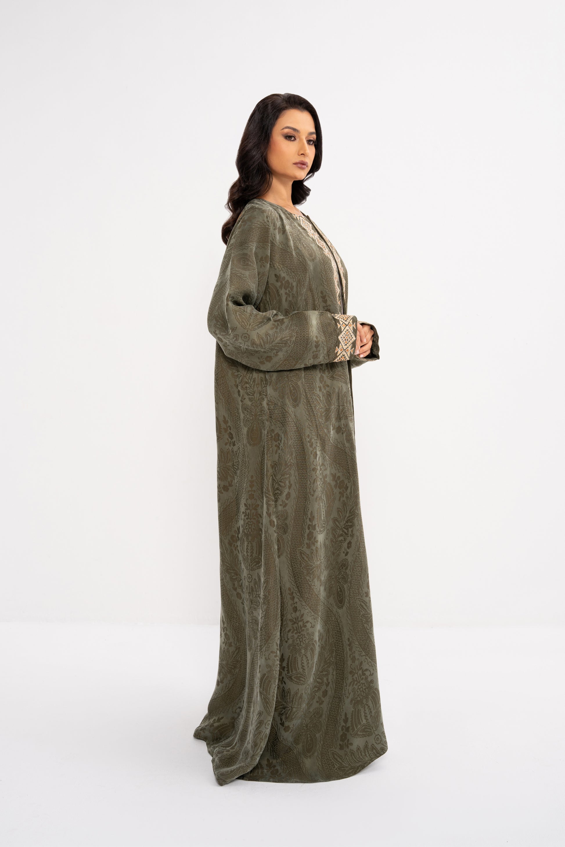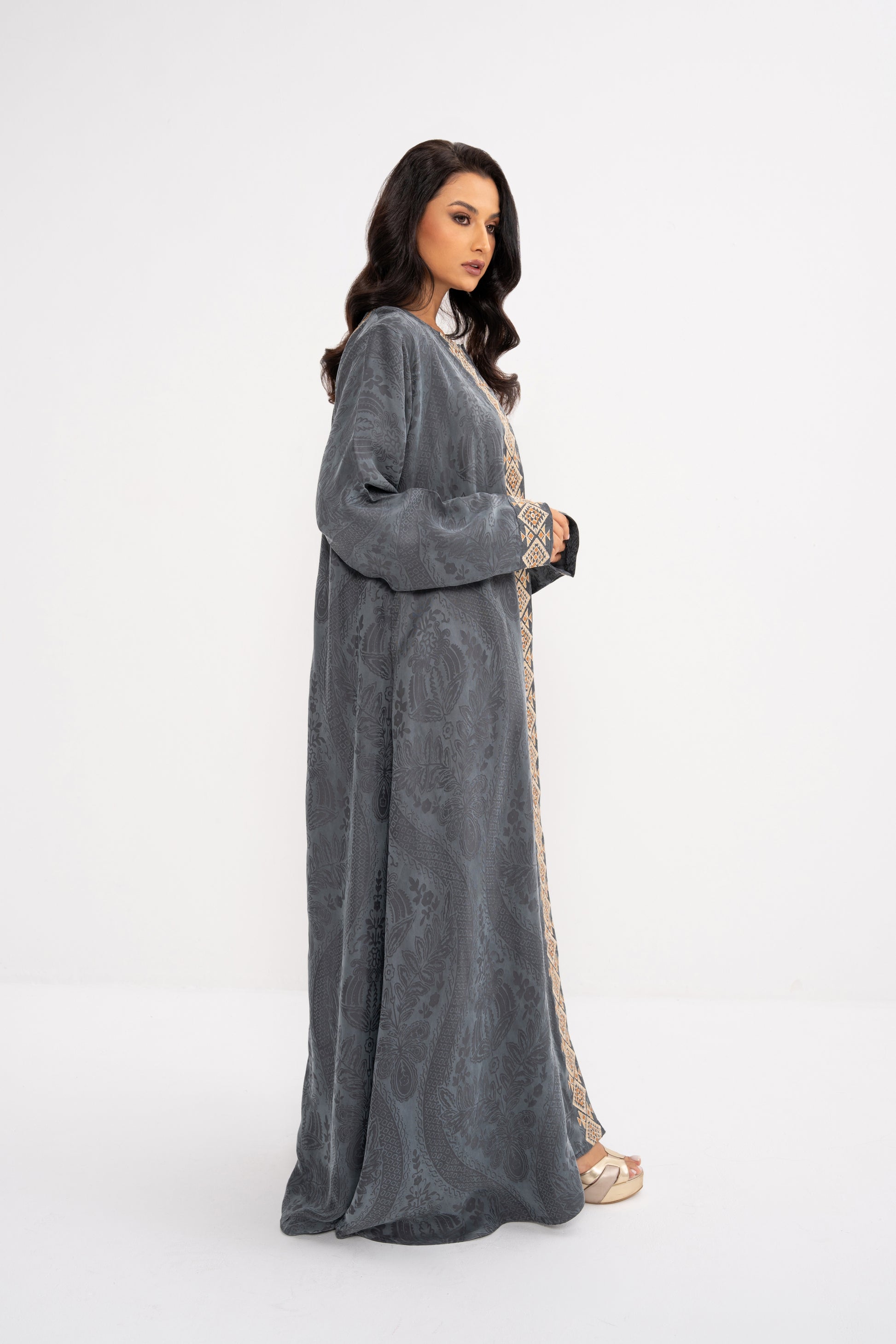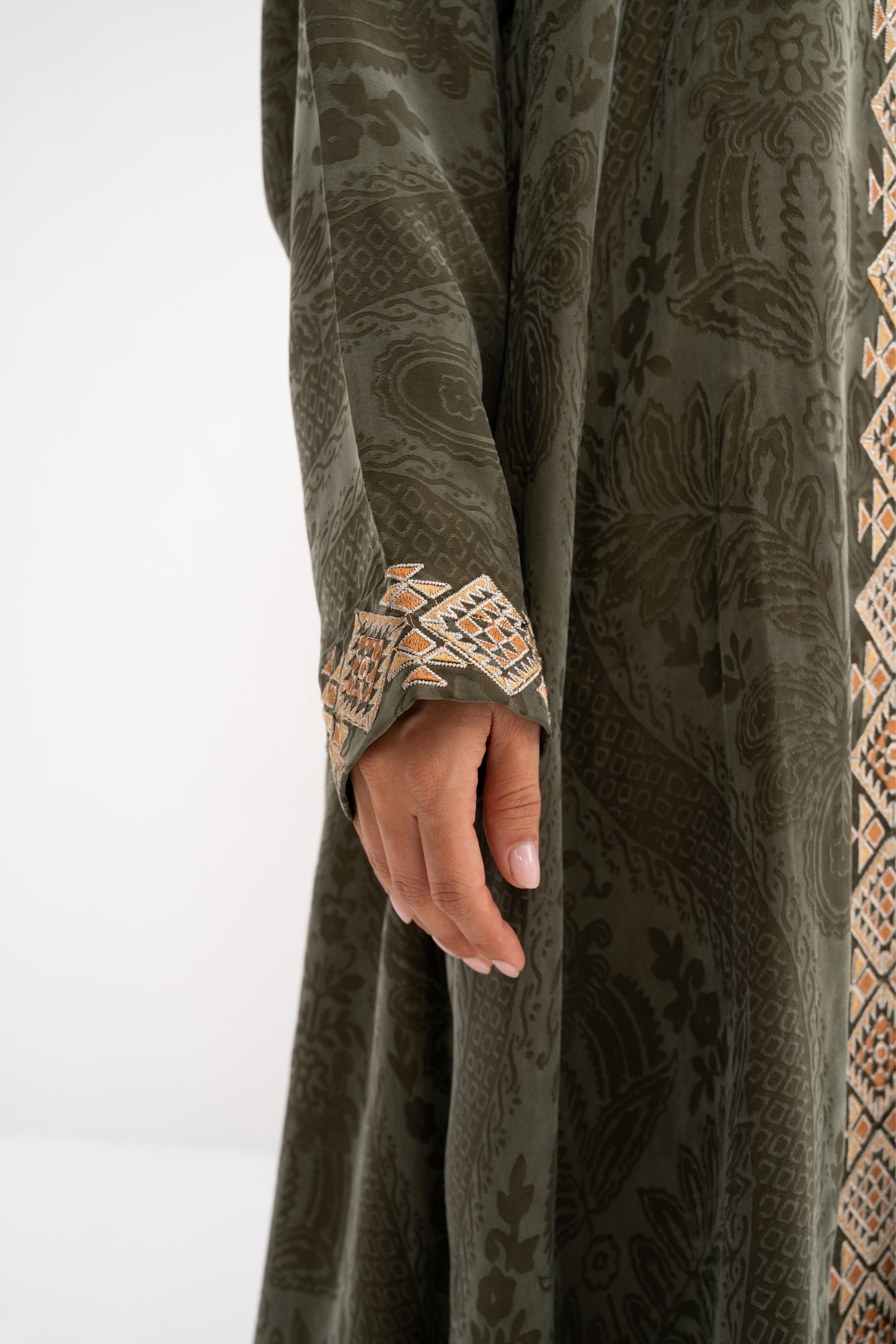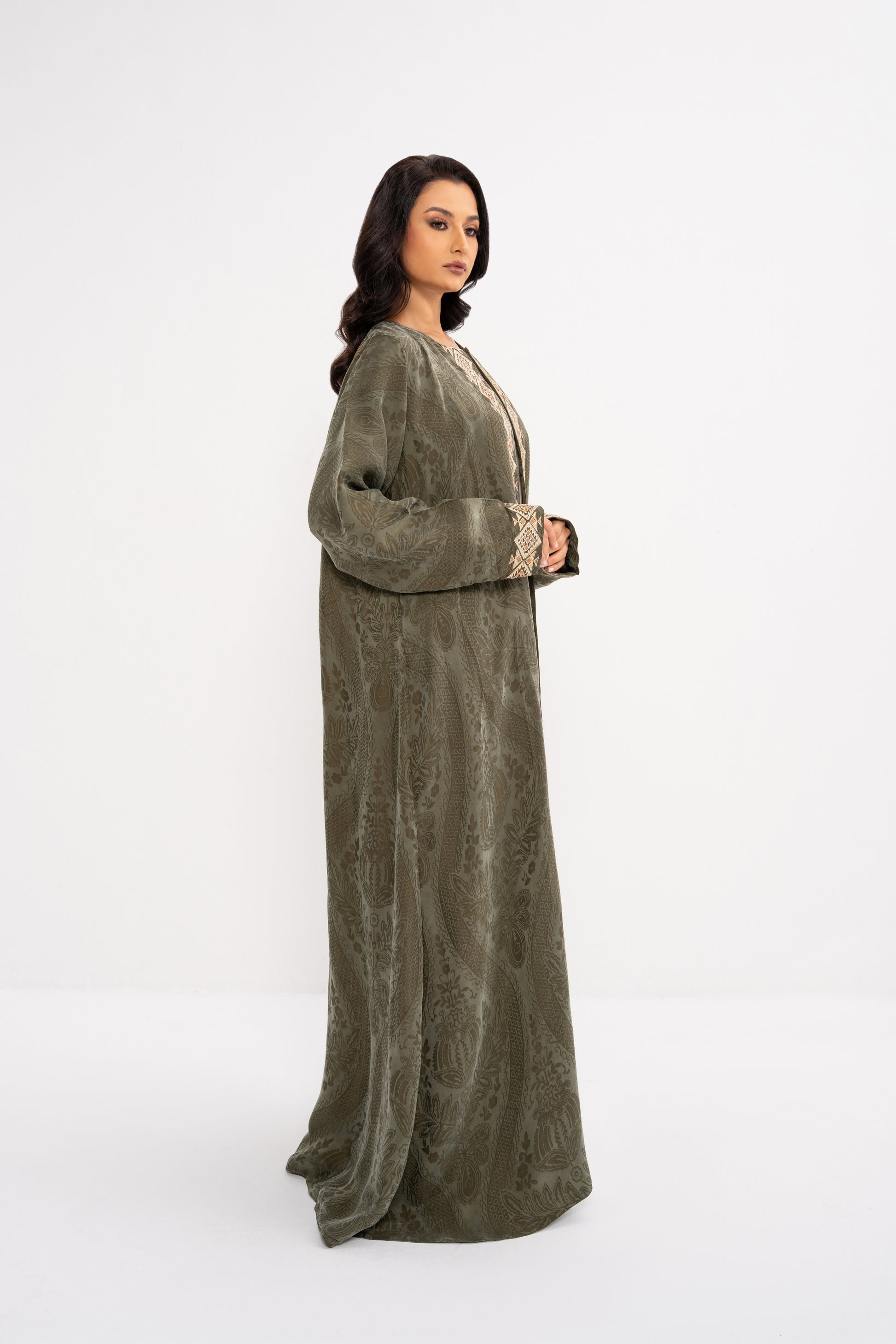 عباءة مع طرحة متناسقة مصنوعة من قماش الجاكار المخملي الخفيف، ومطرزة بتفاصيل هندسية تراثية على طول الجزء الأمامي والخلفي من العباءة.