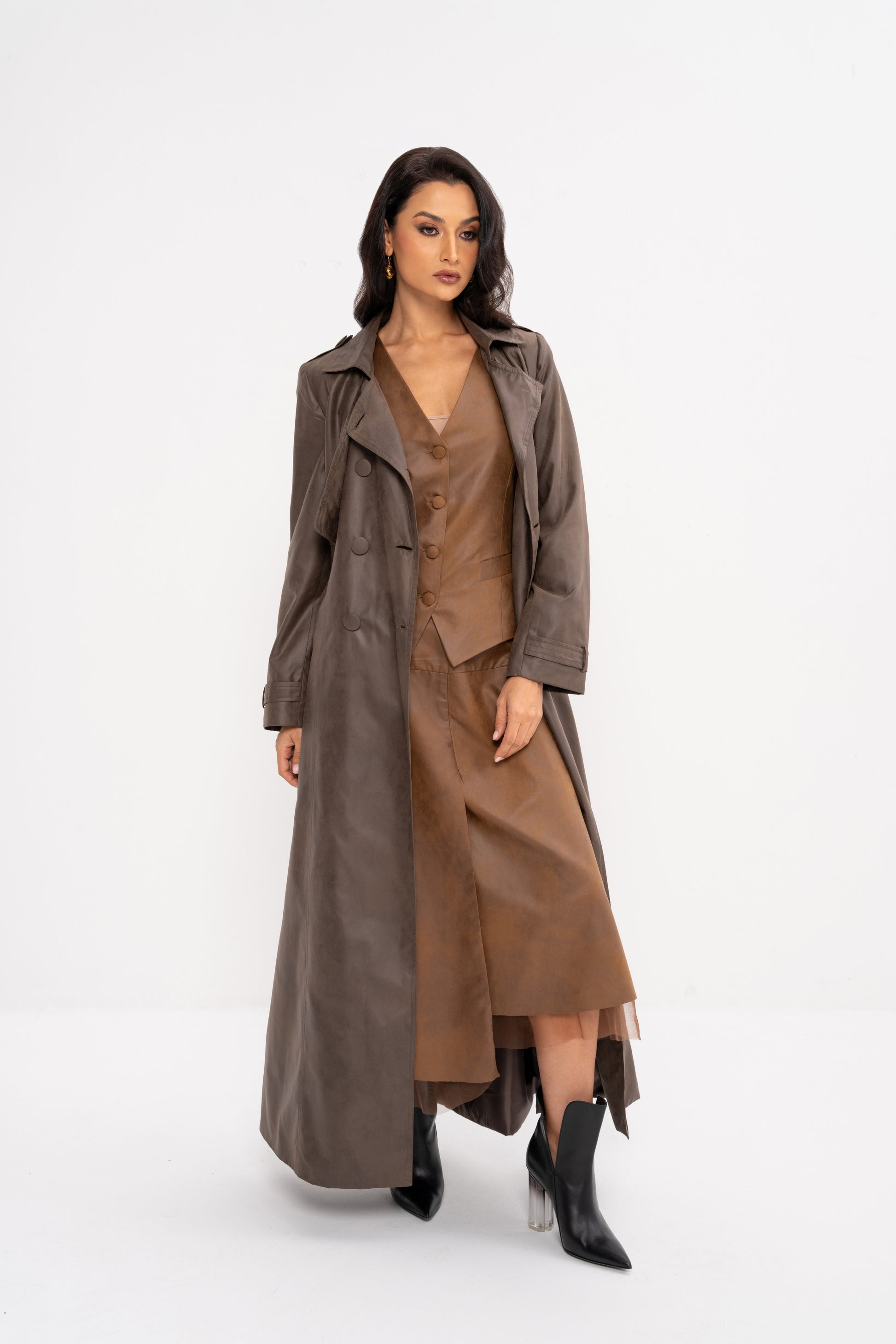 طقم أنيق وعصري - اكتشفي الأناقة المعاصرة مع طقم السترة والتنورة الجلدية، المصنوع من جلد فاخر خفيف الوزن. تصميم أنيق وعصري يجمع بين الراحة والفخامة، مثالي للعمل والمناسبات النهارية.