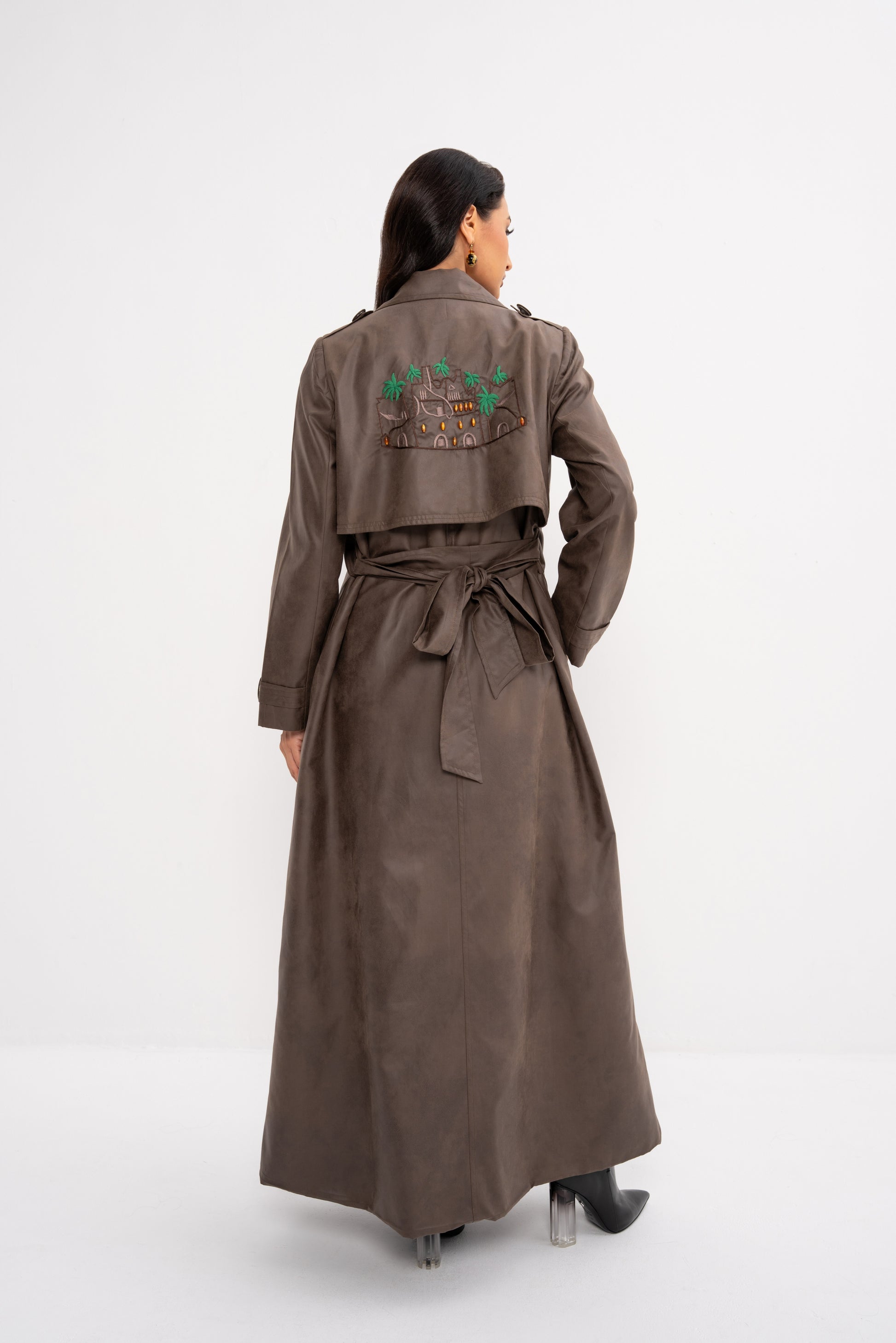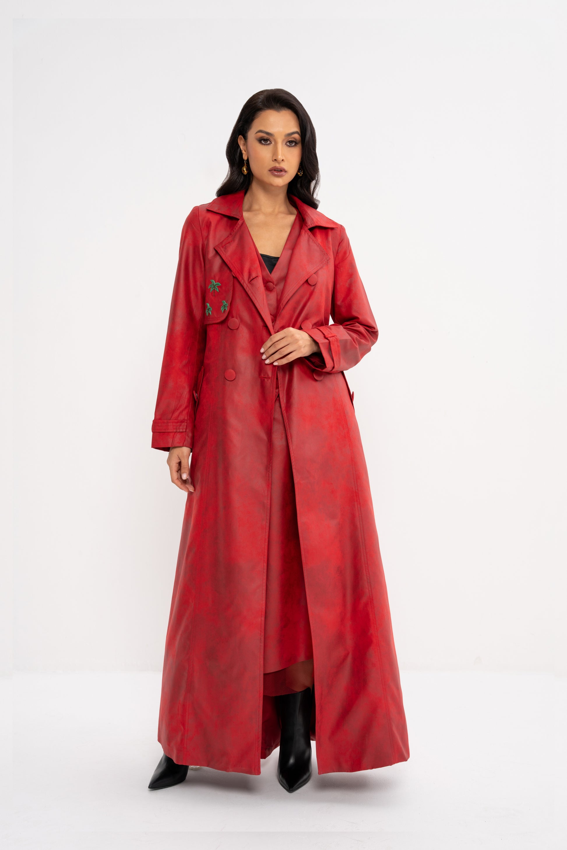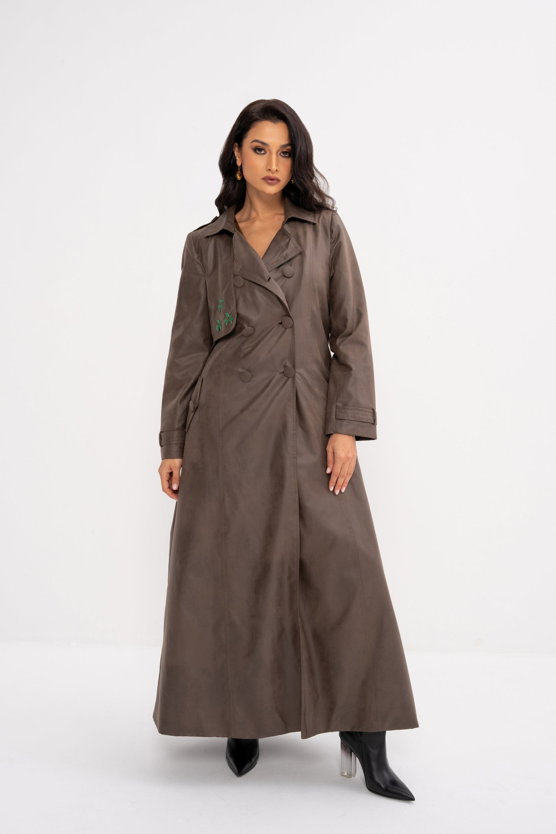 عباية ترنش مصنوعة من جلد فاخر خفيف الوزن، تجمع بين القوة والأنوثة في تصميم كلاسيكي أنيق. تتميز بتطريز يدوي على الظهر بخيوط من الصوف والحرير، مما يضفي لمسة فنية راقية على مظهرها الجريء. قطعة فريدة من نوعها تجسد الأناقة والثقة والحرفية الاستثنائية.