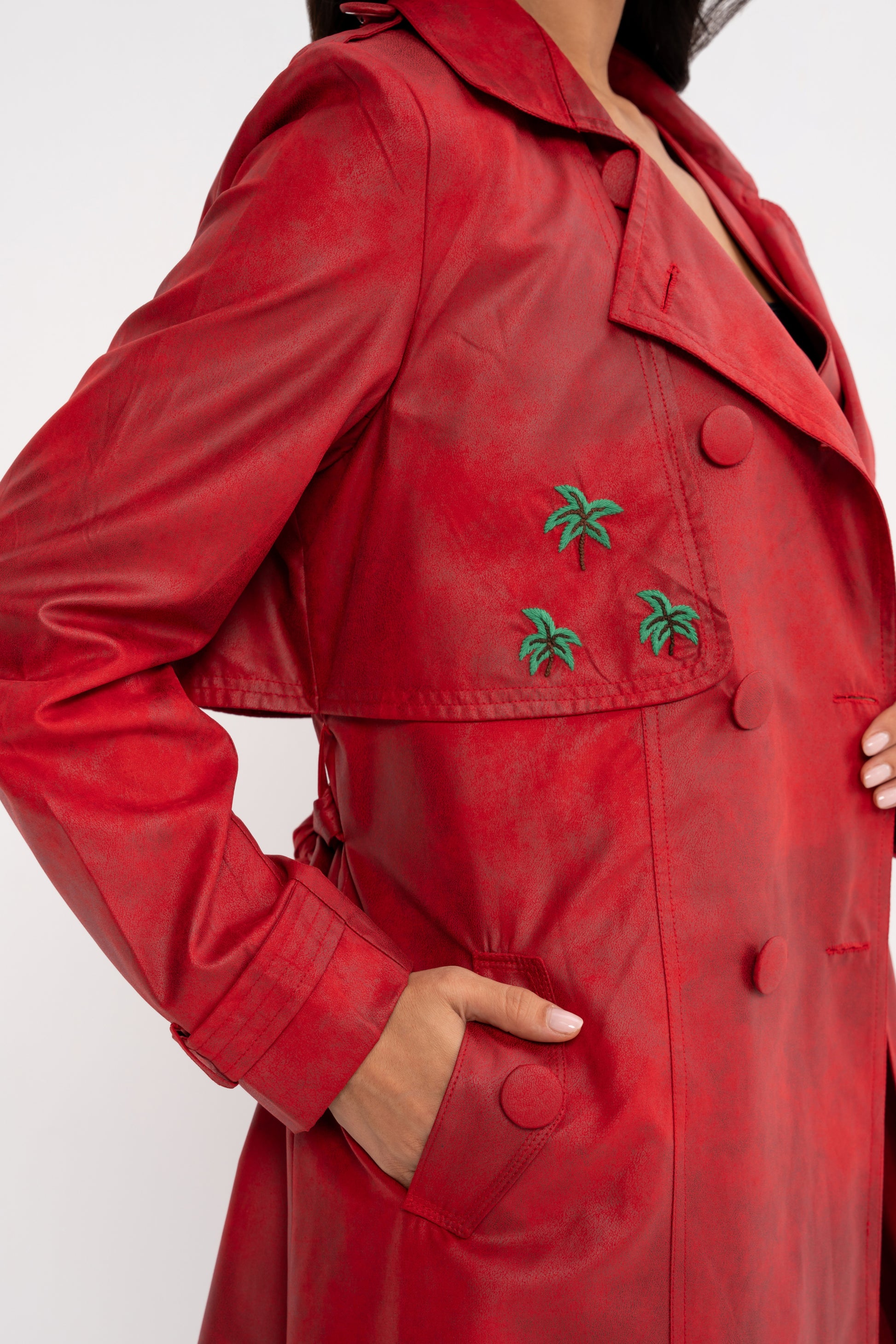 معطف واقٍ من المطر مصنوع من قماش جلدي خفيف الوزن مطرز بالصوف، مع حزام.