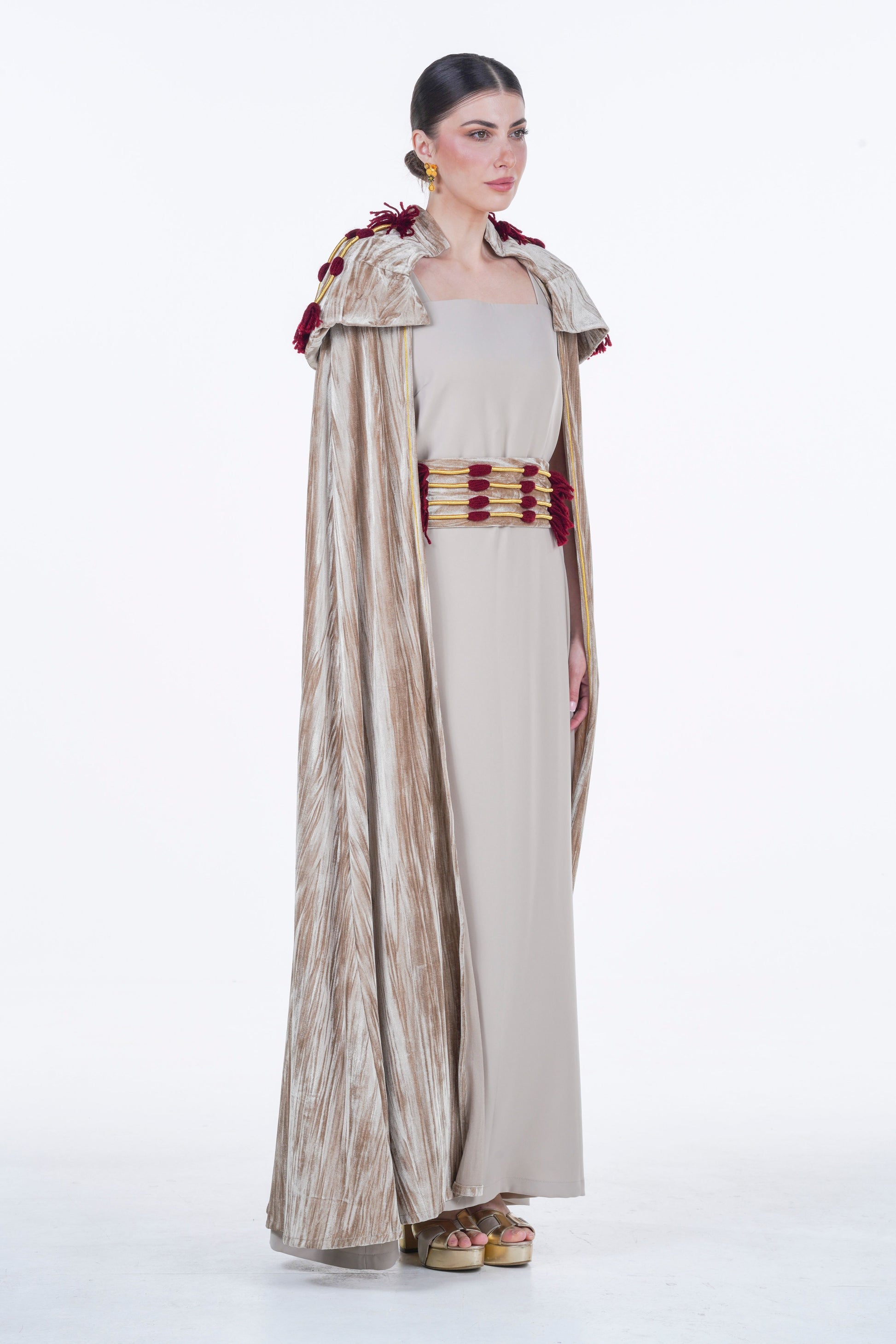 A luxurious two-piece ensemble combining the sleek elegance of a soft crepe jalabiya with the majestic drape of a textured light velvet abaya. The design is masterfully elevated by authentic heritage details, featuring burgundy woolen "Agal Muqassab" and gold trims on the shoulders, paired with a statement waist belt to create a structured, regal silhouette perfect for your most prestigious events.